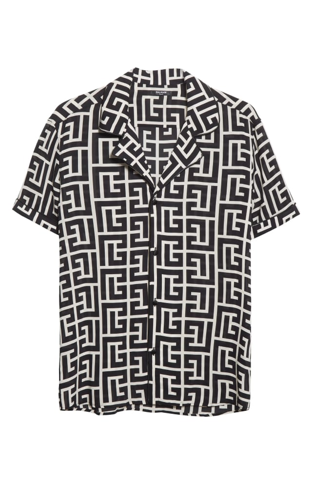 Pierre Balmain’s fascination with the labyrinthine gardens of France inspires the monogram pattern of a camp shirt cut from silky viscose.